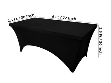 For 6' tables (touches floor), for 8' tables (1/4 off the floor), round corners for a nicer fall, polyester